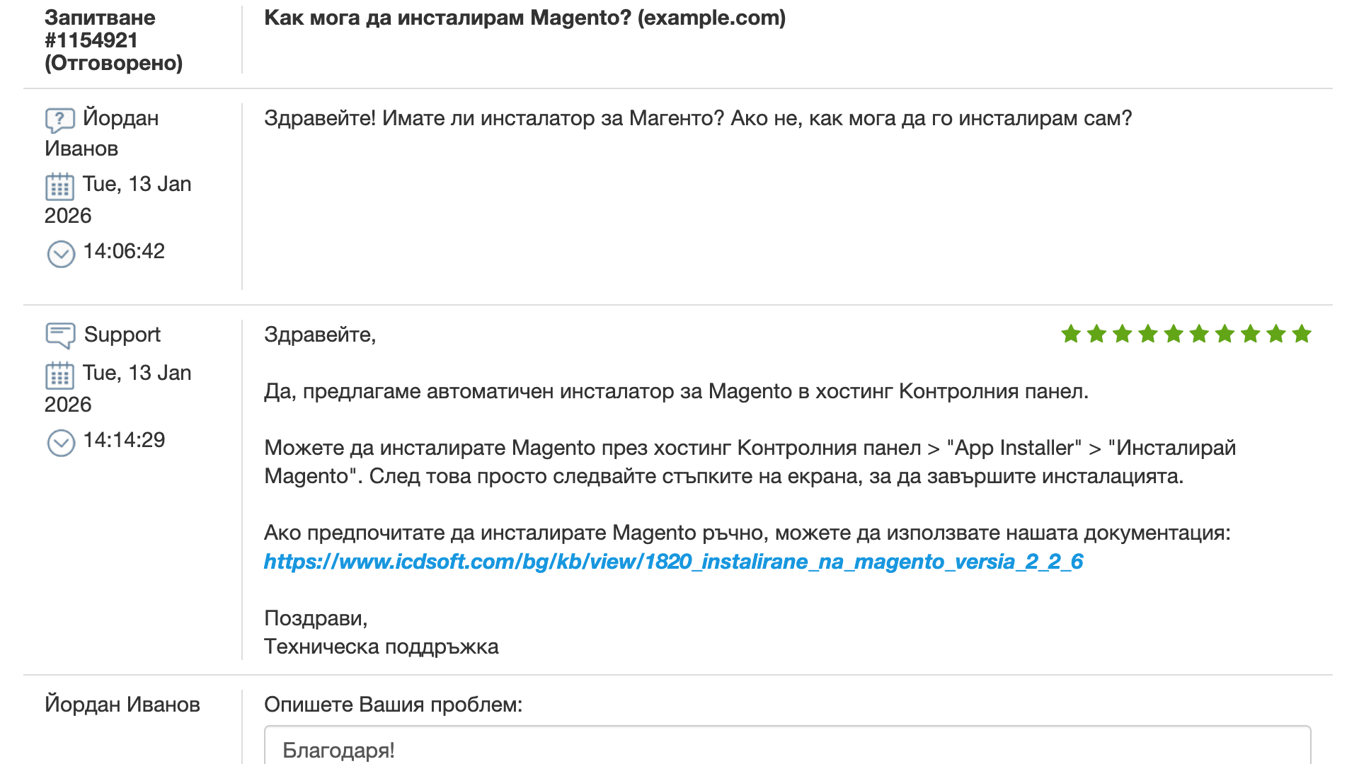 “Клиент съм на ICDSoft от три години и бих искал съвсем искрено да споделя възхищението си от услугите и обслужването в тази компания. Казвам това с допълнението, че използвам тази компания не само за хостинг на моя сайт, но също така и за много от сайтовете на мои клиенти. Причината за това е много простичка – ICDSoft предлагат отличен хостинг с много добри, комплексни качества. Те предлагат бърз и надежден достъп до сървърите, контролен панел и уеб мейл с удобен интерфейс, добре конфигурирани машини, полезни статистики, и което е най-важното за мен - постоянен, бърз и денонощен съпорт.”