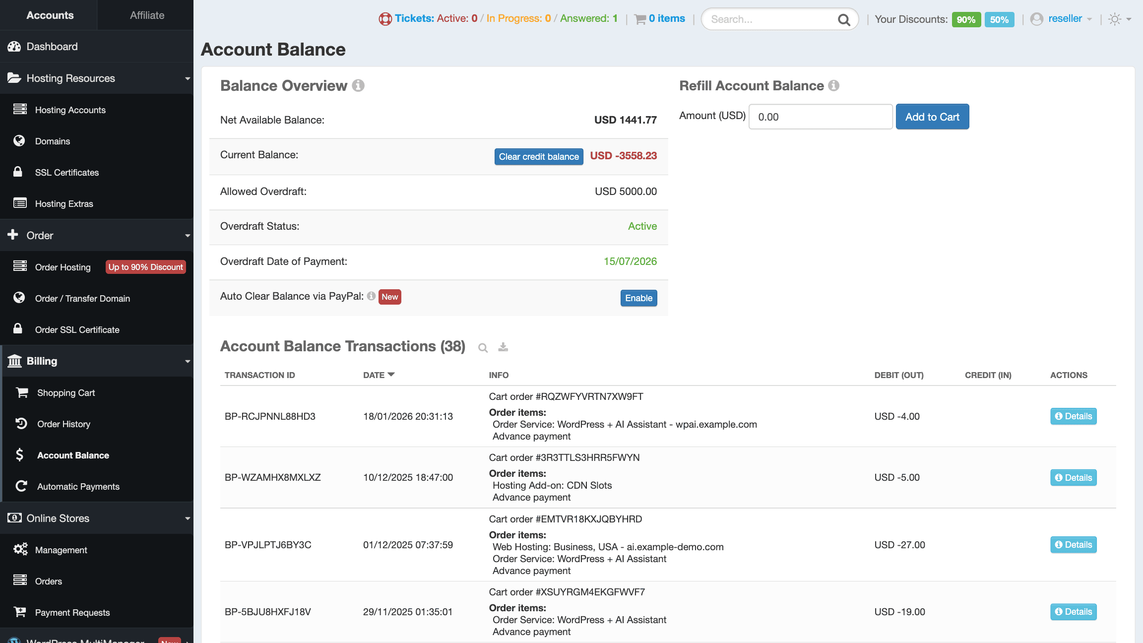 The overdraft amount is calculated according to a dynamic formula, based on the number of accounts/services in the ICDSoft Account Panel. The more active services you have in your partner account, and the longer they are prepaid for, the greater the amount of the allowed overdraft will be. Further information is available for logged in users in the Help section of the Account Panel: